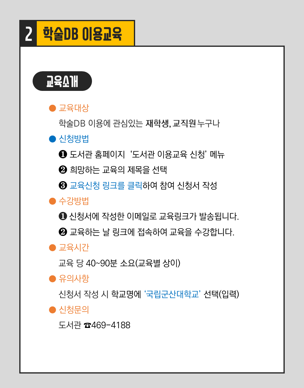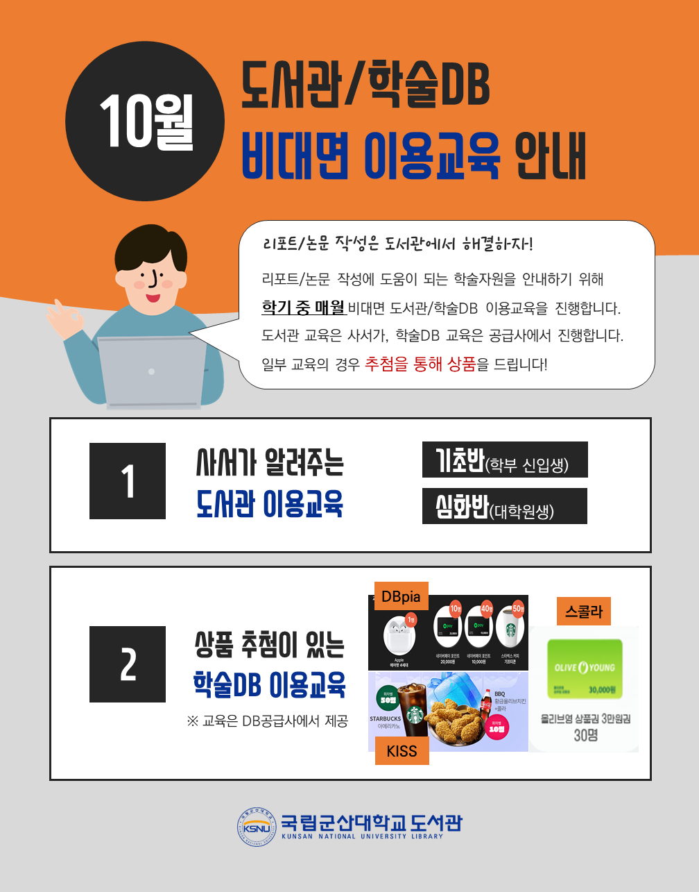 10¿ù ºñ´ë¸é µµ¼°ü/ÇмúDB À̿뱳À° ¾È³» ¸®Æ÷Æ®/³í¹® ÀÛ¼º¿¡ ÇÊ¿äÇÑ ´Ù¾çÇÑ Âü°í¹®ÇåÀ» µµ¼°ü¿¡¼ ã¾Æº¸¼¼¿ä. µµ¼°ü/ÇмúDB ÀÌ¿ë¹æ¹ýÀ» ÇбâÁß ¸Å¿ù ºñ´ë¸éÀ¸·Î ¾È³»ÇÕ´Ï´Ù. µµ¼°ü À̿뱳À°Àº »ç¼°¡, ÇмúDB À̿뱳À°Àº °ø±Þ»ç¿¡¼ Á¦°øÇÕ´Ï´Ù. ÀϺΠ±³À°ÀÇ °æ¿ì Ãß÷À» ÅëÇØ »óǰÀ» Á¦°øÇÏ´Ï ¸¹ÀÌ Âü¿©ÇØ ÁÖ¼¼¿ä. (¹®ÀÇ) µµ¼°ü 063-469-4188