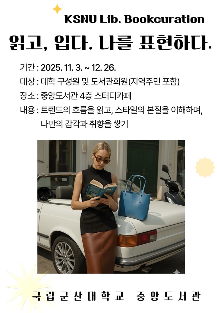 📚¡¸KSNU Lib ºÏÅ¥·¹À̼Ç- 'Àаí ÀÔ´Ù. ³ª¸¦ Ç¥ÇöÇÏ´Ù. ' µµ¼ Àü½Ã 📅 ±â°£: 2025. 11. 3.(¿ù) ~ 12. 26.(±Ý) 🏢 Àå¼Ò: Áß¾Óµµ¼°ü 4Ãþ ½ºÅ͵ðÄ«Æä 👧🏻 ´ë»ó: ±º»ê´ëÇб³ ±¸¼º¿ø, µµ¼°ü ȸ¿ø(Áö¿ªÁֹΠÆ÷ÇÔ) 📢 ³»¿ë: Æ®·»µåÀÇ È帧À» Àаí, ½ºÅ¸ÀÏÀÇ º»ÁúÀ» ÀÌÇØÇϰí, ³ª¸¸ÀÇ °¨°¢°ú ÃëÇâ ½×±â 🎨 µµ¼´ëÃâ: ´ëÃ⠱Ⱓ 10ÀÏ(¸ðµç½ÅºÐ µ¿ÀÏ), ¿¹¾à°¡´É, ¿¬ÀåºÒ°¡ ✍🏻 ¹®ÀÇ: µµ¼°ü ÀÚ·á¿î¿µÆÀ(¢Ï469-4183) 🙌±¸¼º¿ø ¿©·¯ºÐÀÇ ¸¹Àº ÀÌ¿ë ¹Ù¶ø´Ï´Ù.🙌