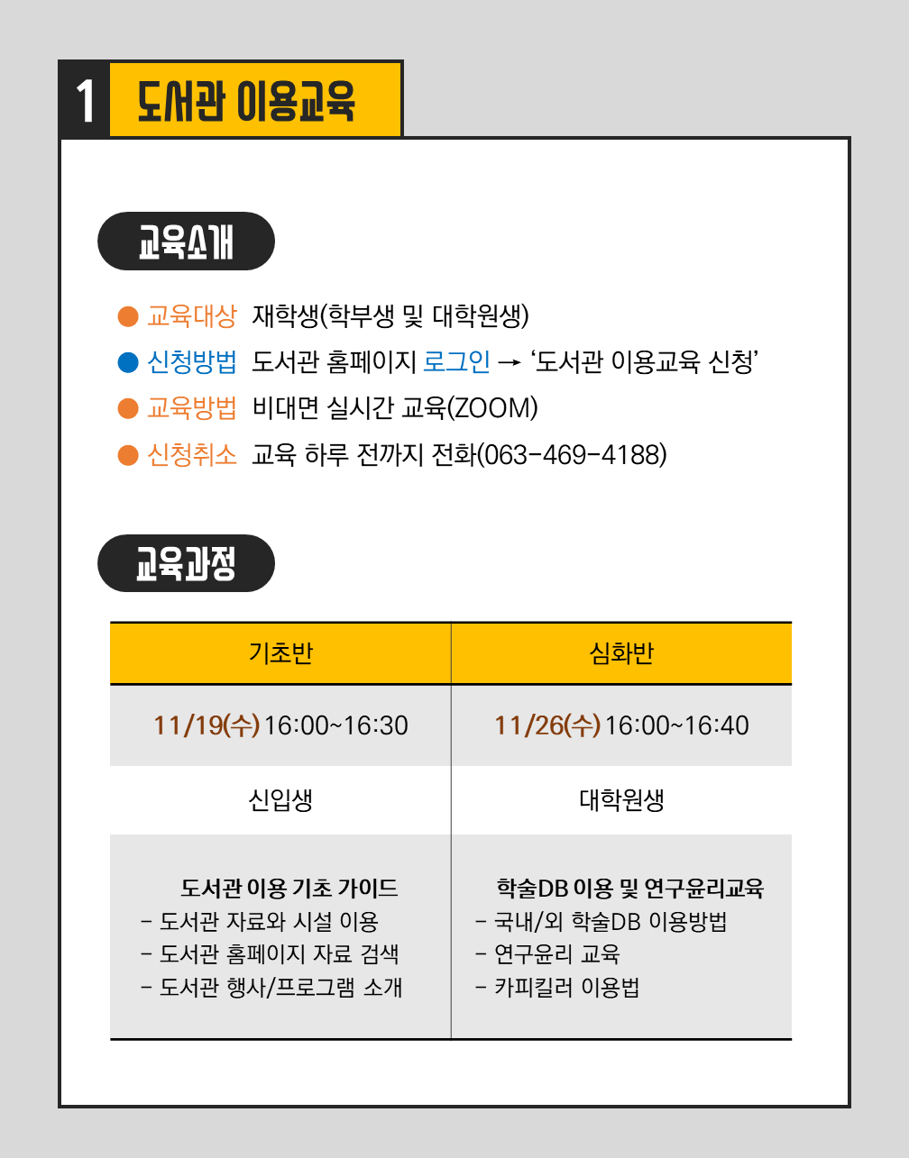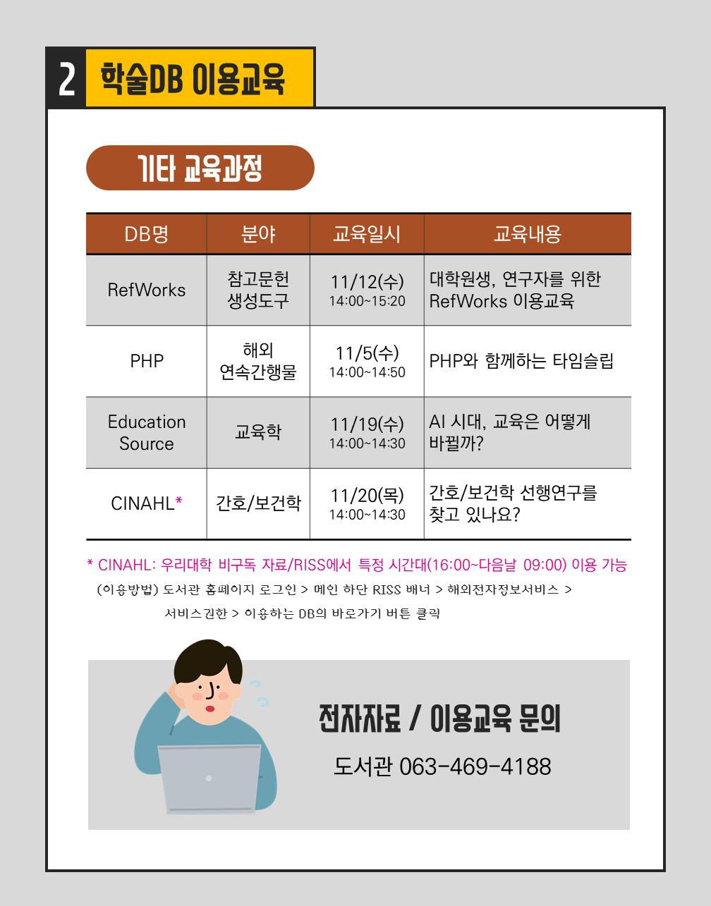 11¿ù ºñ´ë¸é µµ¼°ü/ÇмúDB À̿뱳À° ¾È³» ¸®Æ÷Æ®/³í¹® ÀÛ¼º¿¡ ÇÊ¿äÇÑ ´Ù¾çÇÑ Âü°í¹®ÇåÀ» µµ¼°ü¿¡¼ ã¾Æº¸¼¼¿ä. µµ¼°ü/ÇмúDB ÀÌ¿ë¹æ¹ýÀ» ÇбâÁß ¸Å¿ù ºñ´ë¸éÀ¸·Î ¾È³»ÇÕ´Ï´Ù. µµ¼°ü À̿뱳À°Àº »ç¼°¡, ÇмúDB À̿뱳À°Àº °ø±Þ»ç¿¡¼ Á¦°øÇÕ´Ï´Ù. ÀϺΠ±³À°ÀÇ °æ¿ì Ãß÷À» ÅëÇØ »óǰÀ» Á¦°øÇÏ´Ï ¸¹ÀÌ Âü¿©ÇØ ÁÖ¼¼¿ä. (¹®ÀÇ) µµ¼°ü 063-469-4188
