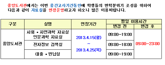Áß¾Óµµ¼°ü ÀÚ·á½Ç 23½Ã±îÁö ¿¬Àå¿î¿µ(4/15~25) °Ô½Ã¹° ³»¿ë º¸±â