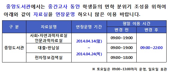 Áß¾Óµµ¼°ü ÀÚ·á½Ç ¿¬Àå¿î¿µ(04.14~04.24)