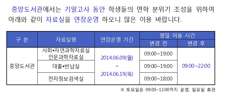 Áß¾Óµµ¼°ü ½ÃÇè±â°£ ÀÚ·á½Ç ¿¬Àå¿î¿µ(6/9~19) °Ô½Ã¹° ³»¿ë º¸±â