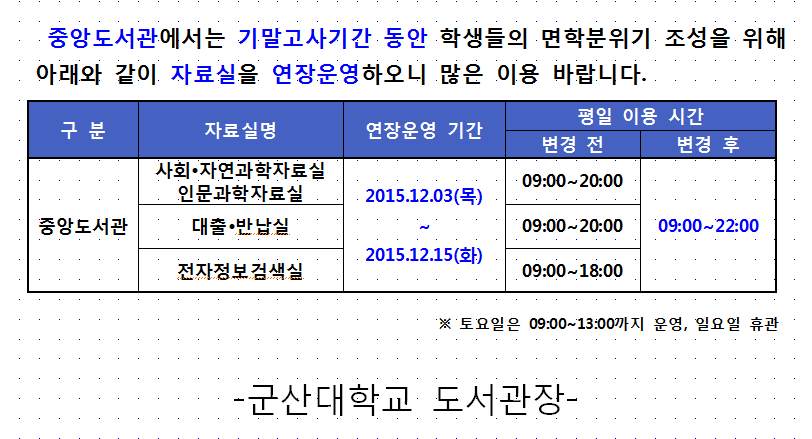 Áß¾Óµµ¼°ü ¿¬Àå¿î¿µ ¾È³»(±â¸»°í»ç±â°£ ÆòÀÏ) °Ô½Ã¹° ³»¿ë º¸±â