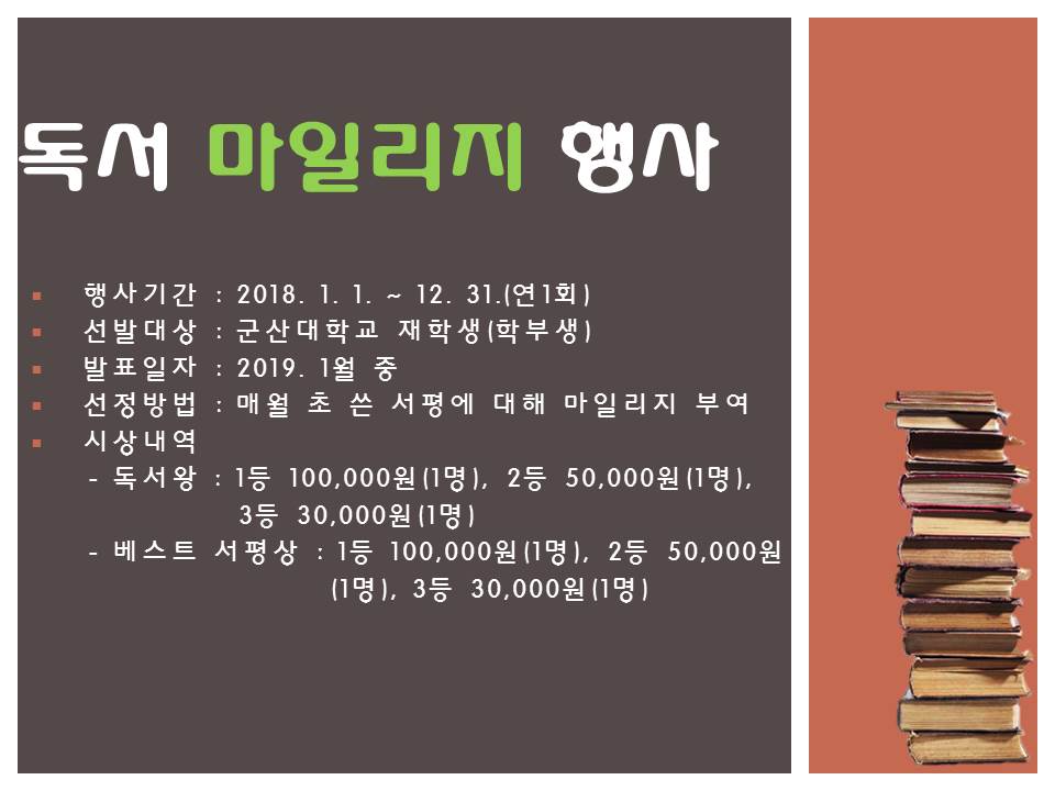 1. µ¶¼¸¶Àϸ®ÁöȨÆäÀÌÁö¸¦ ÅëÇÑ ¼Æò¾²±â(µ¶¼°¨»ó¹®) ¾È³» °¡. °ÔÀç ¹æ¹ý : Ã¥À» ÀÐ°í µ¶¼¸¶Àϸ®ÁöȨÆäÀÌÁö(http://bookclub.kunsan.ac.kr/)¿¡ ¼Æò¾²±â ³ª. °ÔÀç Ƚ¼ö : Á¦ÇÑ ¾øÀ½(´Ü ÀåÇÐ±Ý ¸¶Àϸ®Áö´Â ¿¬ 20Á¡ ÀÎÁ¤) 2. µ¶¼¸¶Àϸ®Áö Æò°¡ ¹æ¹ý °¡. Æò°¡±â°£ : ¿ù 1ȸ(¸Å¿ù ÃÊ) ³ª. Æò°¡¹æ¹ý - 1~10Á¡ ºÎ¿©(ȹµæÁ¡¼ö µ¶¼¸¶Àϸ®Áö Á¡¼ö ÀÎÁ¤) - 1ȸ´ç 1Á¡ ÀÌ»ó ȹµæ µ¶¼¸¶Àϸ®Áö·Î ÀÎÁ¤µÈ ¼Æò¾²±â´Â ¸¶Àϸ®Áö ÀåÇÐ±Ý 2Á¡ºÎ¿© - Ç¥ÀýÀÎ °æ¿ì 0Á¡À¸·Î ÀÎÁ¤¾ÈÇÔ 3. ¸¶Àϸ®Áö ÀåÇÐ±Ý ÀÎÁ¤ Å뺸 °¡. µ¶¼¸¶Àϸ®Áö Æò°¡ÈÄ 1ȸ´ç 2Á¡ºÎ¿© ÇлýÄ¿¸®¾î½Ã½ºÅÛ¿¡ ÀÔ·Â : ¸ÅÇбâ ÃÊ ³ª. ÃÖ´ë ÀÎÁ¤Á¡¼ö : ¿¬ 20Á¡(µ¶¼¸¶Àϸ®Áö 10ȸ ¼Æò¾²±â(µ¶¼°¨»ó¹®)¿¡ ÇØ´ç) 4. ¼Æò¾²±â ¿ì¼öÀÚ ½Ã»ó °¡. ½Ã»ó³»¿ª - µ¶¼¿Õ . 1À§ 100,000¿ø(1¸í), 2À§ 50,000¿ø(1¸í), 3À§ 30,000¿ø(1¸í) - º£½ºÆ® ¼Æò»ó . 1À§ 100,000¿ø(1¸í), 2À§ 50,000¿ø(1¸í), 3À§ 30,000¿ø(1¸í) ³ª. ±â°£ : 2018. 1. ~ 12. (¿¬ 1ȸ ½Ã»ó)