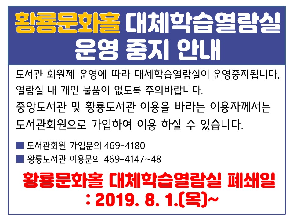 | Á¦ ¸ñ | Ȳ·æ¹®ÈȦ ´ëüÇнÀ¿¶÷½Ç ¿î¿µ ÁßÁö ¾È³» | ||||