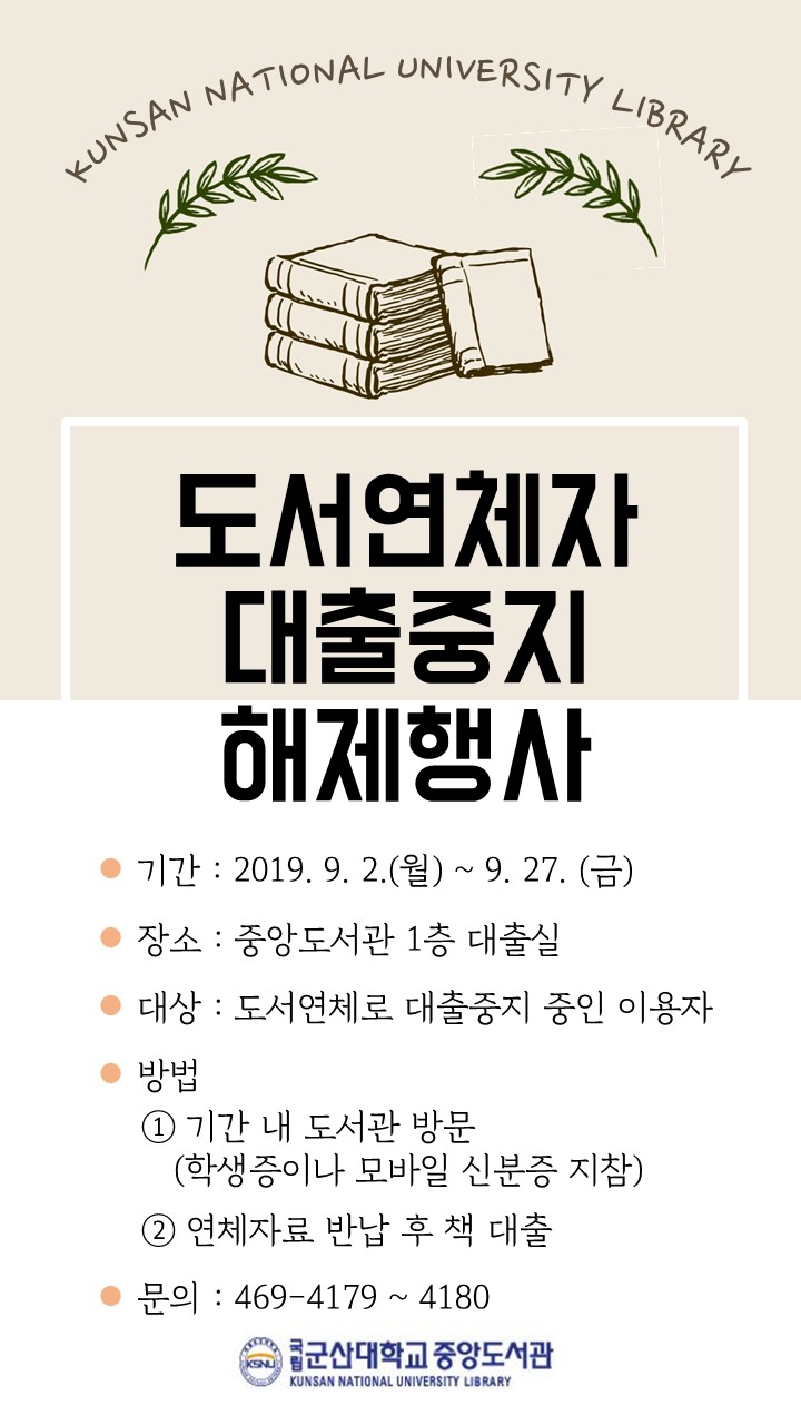 9¿ù µ¶¼ÀÇ ´Þ°ú °³°À» ¸Â¾Æ ÀÚ·áÀÌ¿ëÀ» Ȱ¼ºÈÇϰí Ã¥°ú ÇÔ²²ÇÏ´Â ´ëÇÐ ¹®ÈÁ¶¼º¿¡ ±â¿©Çϱâ À§ÇØ ¡¸2019³âµµ µµ¼¿¬Ã¼ÀÚ ´ëÃâÁßÁö ÇØÁ¦ Çà»ç¡¹¸¦ ¸¶·ÃÇÏ¿´½À´Ï´Ù. °ü½ÉÀÖ´Â ÀÌ¿ëÀںеéÀÇ ¸¹Àº Âü¿© ¹Ù¶ø´Ï´Ù.