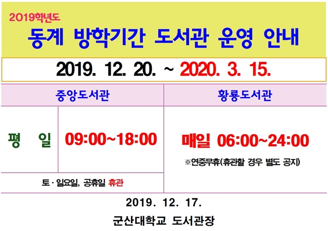 | Á¦ ¸ñ | °Ü¿ï¹æÇÐ µµ¼°ü ¿î¿µ½Ã°£ ¾È³» | ||||