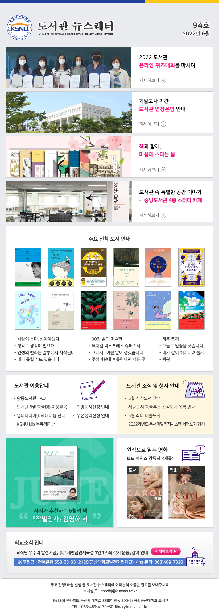 Ã¥°ú ÇÔ²² ¸¶À½¿¡ ½º¹Ì´Â º½, KSNU Lib ºÏÅ¥·¹À̼Ç(±×°Å ¾Ë¾Æ? MBTI U+I), 2022 µµ¼°ü ÀüÀÚÃ¥ ´Ùµ¶»ó Çà»ç, '»ç¼°¡ ÃßõÇÏ´Â 5¿ùÀÇ Ã¥(·ê·ç ¹Ð·¯ Àú '¹°°í±â´Â Á¸ÀçÇÏÁö ¾Ê´Â´Ù'), µµ¼°ü ÃÖ±Ù ¼Ò½Ä ¹× Çà»ç, ÁÖ¿ä ½Å°£µµ¼ ¾È³»