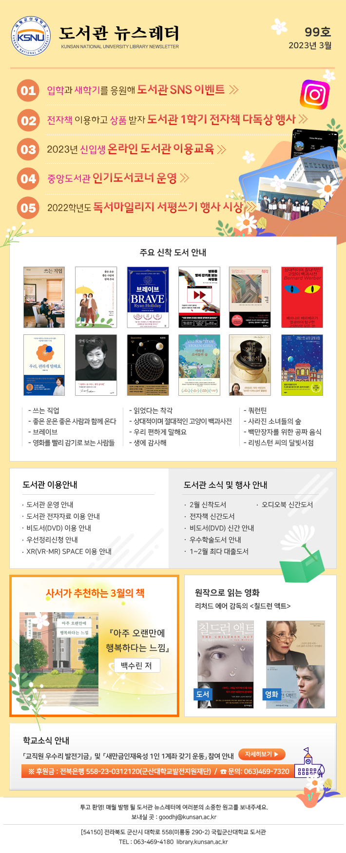µµ¼°ü SNS À̺¥Æ®, Áß¾Óµµ¼°ü Àα⵵¼ ÄÚ³Ê ¿î¿µ, 1Çбâ ÀüÀÚÃ¥ ´Ùµ¶»ó Çà»ç, 2023³â ½ÅÀÔ»ý ¿Â¶óÀÎ µµ¼°ü À̿뱳À°, '»ç¼°¡ ÃßõÇÏ´Â 3¿ùÀÇ Ã¥(¹é¼ö¸° Àú '¾ÆÁÖ ¿À·£¸¸¿¡ ÇູÇÏ´Ù´Â ´À³¦'), µµ¼°ü ÃÖ±Ù ¼Ò½Ä ¹× Çà»ç, ÁÖ¿ä ½Å°£µµ¼ ¾È³» °Ô½Ã¹° ³»¿ë º¸±â
