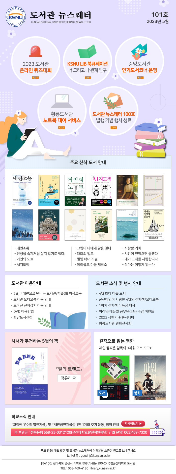 2023 µµ¼°ü ¿Â¶óÀÎ ÄûÁî ´ëȸ, ºÏÅ¥·¹ÀÌ¼Ç '³Ê ±×¸®°í ³ª °ü°è ޱ¸', Áß¾Óµµ¼°ü Àα⵵¼ÄÚ³Ê ¿î¿µ, '»ç¼°¡ ÃßõÇÏ´Â 5¿ùÀÇ Ã¥(Á¤À¯¶ó Àú '¸»ÀÇ Æ®·»µå'), µµ¼°ü ÃÖ±Ù ¼Ò½Ä ¹× Çà»ç, ÁÖ¿ä ½Å°£µµ¼ ¾È³» °Ô½Ã¹° ³»¿ë º¸±â
