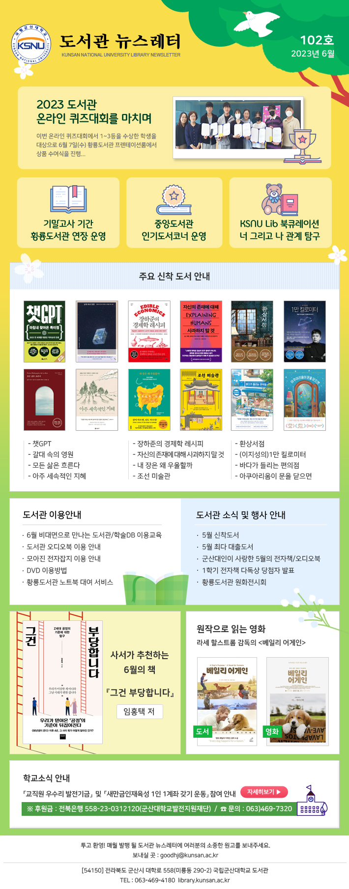 2023 µµ¼°ü ¿Â¶óÀÎ ÄûÁî ´ëȸ, ºÏÅ¥·¹ÀÌ¼Ç '³Ê ±×¸®°í ³ª °ü°è ޱ¸', Áß¾Óµµ¼°ü Àα⵵¼ÄÚ³Ê ¿î¿µ, '»ç¼°¡ ÃßõÇÏ´Â 5¿ùÀÇ Ã¥(Á¤À¯¶ó Àú '¸»ÀÇ Æ®·»µå'), µµ¼°ü ÃÖ±Ù ¼Ò½Ä ¹× Çà»ç, ÁÖ¿ä ½Å°£µµ¼ ¾È³»