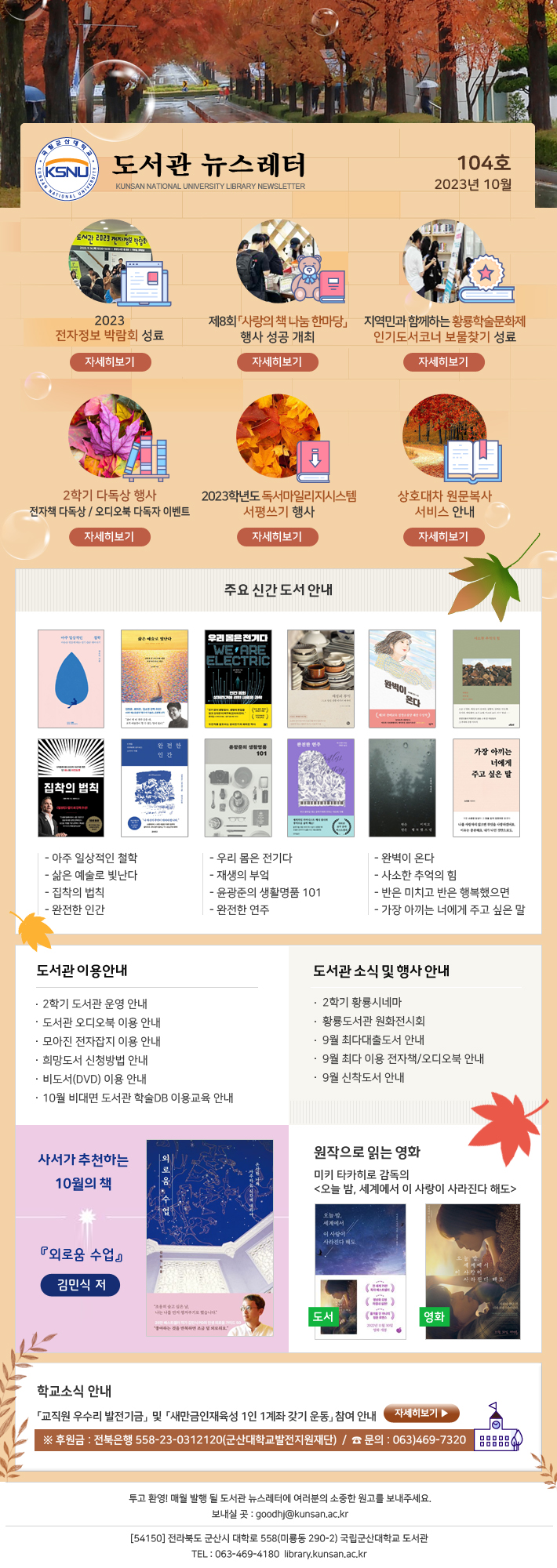 ±º»ê, ±× ³¡¾ø´Â À̾߱â Çà»ç ¼º·á, KSNU Lib. ºÏÅ¥·¹À̼Ç-´Þ·Á¶ó µµ¼Àü½Ã ¼º·á, µ¶¼¸¶Àϸ®Áö½Ã½ºÅÛ ¼Æò¾²±â Çà»ç, Àå¼±âÁõ¿îµ¿ ¾È³», »ç¼°¡ ÃßõÇÏ´Â 11¿ùÀÇ Ã¥(±èµ¿½Ä Àú 'Àλý ¹Ú¹°°ü'), µµ¼°ü ÃÖ±Ù ¼Ò½Ä ¹× Çà»ç, ÁÖ¿ä ½Å°£µµ¼ ¾È³»
