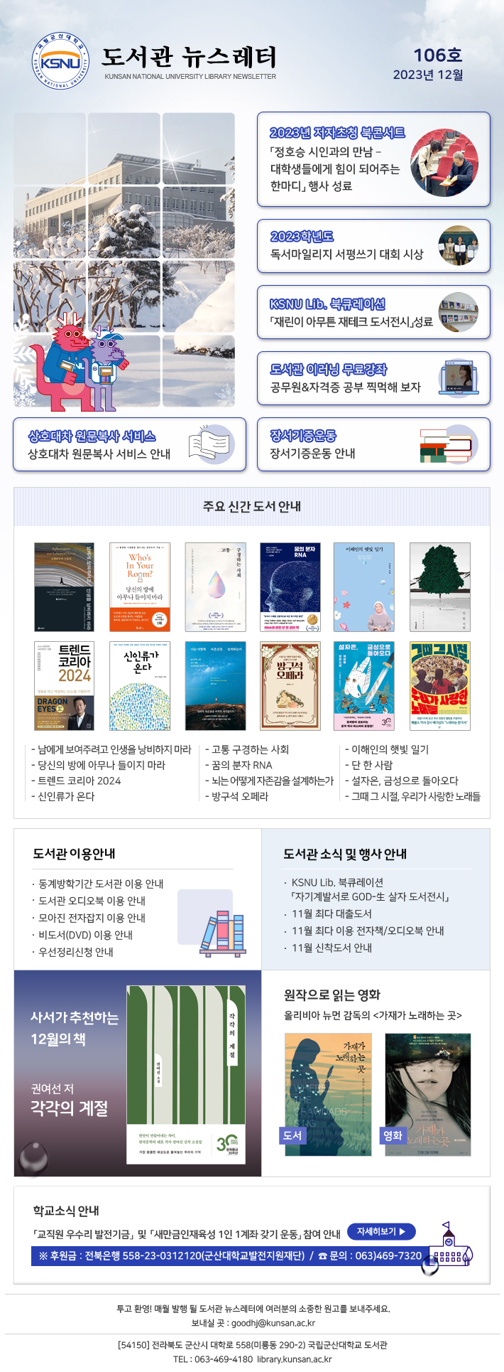 ±º»ê, ±× ³¡¾ø´Â À̾߱â Çà»ç ¼º·á, KSNU Lib. ºÏÅ¥·¹À̼Ç-´Þ·Á¶ó µµ¼Àü½Ã ¼º·á, µ¶¼¸¶Àϸ®Áö½Ã½ºÅÛ ¼Æò¾²±â Çà»ç, Àå¼±âÁõ¿îµ¿ ¾È³», »ç¼°¡ ÃßõÇÏ´Â 11¿ùÀÇ Ã¥(±èµ¿½Ä Àú 'Àλý ¹Ú¹°°ü'), µµ¼°ü ÃÖ±Ù ¼Ò½Ä ¹× Çà»ç, ÁÖ¿ä ½Å°£µµ¼ ¾È³»