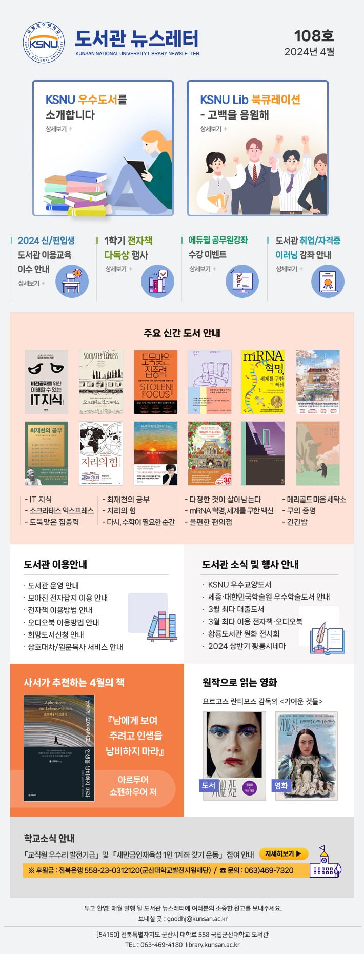 KSNU ¿ì¼öµµ¼ ¾È³», KSNU Lib. ºÏÅ¥·¹ÀÌ¼Ç - °í¹éÀ» ÀÀ¿øÇØ, 1Çбâ ÀüÀÚÃ¥ ´Ùµ¶»ó Çà»ç, »ç¼°¡ ÃßõÇÏ´Â 4¿ùÀÇ Ã¥(¼îÆæÇÏ¿ì¾î Àú '³²¿¡°Ô º¸¿©ÁÖ·Á°í ÀλýÀ» ³¶ºñÇÏÁö ¸¶¶ó'), µµ¼°ü ÃÖ±Ù ¼Ò½Ä ¹× Çà»ç, ÁÖ¿ä ½Å°£µµ¼ ¾È³» °Ô½Ã¹° ³»¿ë º¸±â