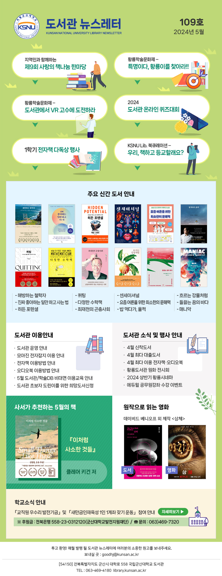 Ȳ·æÇмú¹®ÈÁ¦(Áö¿ª¹Î°ú ÇÔ²²ÇÏ´Â Á¦9ȸ »ç¶ûÀÇ Ã¥³ª´® ÇѸ¶´ç, Ư¸íÀ̴٠Ȳ·æÀ̸¦ ã¾Æ¶ó, µµ¼°ü¿¡¼ VR °í¼ö¿¡ µµÀüÇ϶ó),KSNU Lib. ºÏÅ¥·¹ÀÌ¼Ç - ¿ì¸®, Ã¥ÇÏ°í µî±³ÇÒ·¡¿ä?, 1Çбâ ÀüÀÚÃ¥ ´Ùµ¶»ó Çà»ç, »ç¼°¡ ÃßõÇÏ´Â 5¿ùÀÇ Ã¥(Ŭ·¹¾î Ű°Ç Àú 'ÀÌó·³ »ç¼ÒÇÑ °Íµé'), ¿øÀÛÀ¸·Î Àд ¿µÈ(·ùÀÚÈç Àú '»ïü') µµ¼°ü ÃÖ±Ù ¼Ò½Ä ¹× Çà»ç °Ô½Ã¹° ³»¿ë º¸±â
