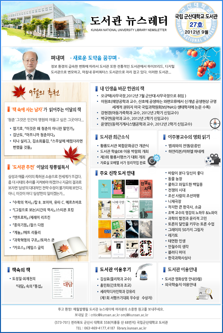 Æì³»¸ç('»õ·Î¿î µµ¾àÀ» ²Þ²Ù¸ç') 9¿ùÀÇ Ãßõ('Ã¥ ¼Ó¿¡ »ç´Â ³²ÀÚ'°¡ ÀоîÁÖ´Â ÀÌ´ÞÀÇ Ã¥, 'µµ¼°ü Ãßõ' ÀÌ´ÞÀÇ È²·æÇʵ¶¼), µµ¼°ü ÀÌ¿ë¾È³»(µµ¼°ü ¿µÈ»ó¿µ9¿ù, ¿Ü±¹ÇмúÁöÁö¿ø¼¾Å͹«·á¿ø¹®º¹»ç), µµ¼°ü ÀÌ¿ëÈıâ, µµ¼°ü ÃÖ±Ù¼Ò½Ä(Ȳ·æµµ¼°ü º¹ÇÕ¹®È°ø°£ °³°ü½Ä, µµ¼°ü ÇмúDB¹Ú¶÷ȸ,3ȸ ¼Æò¾²±â ´ëȸ °³ÃÖ, ÀÚ·á½Ç ¿À¹è¿ ¼°¡Á¤¸®ÀÛ¾÷¿Ï·á), Ã¥¼ÓÀÇ Ã¥(µµÁ¤ÀÏ,ÃÖÀçõÀÇ '´ë´ã' ¼ÓÀÇ 'Åë¼·'), ÁÖ¿ä ½ÅÂø µµ¼ ¾È³», ³» ÀλýÀ» ¹Ù²Û ÇѱÇÀÇ Ã¥, °Ô½Ã¹° ³»¿ë º¸±â