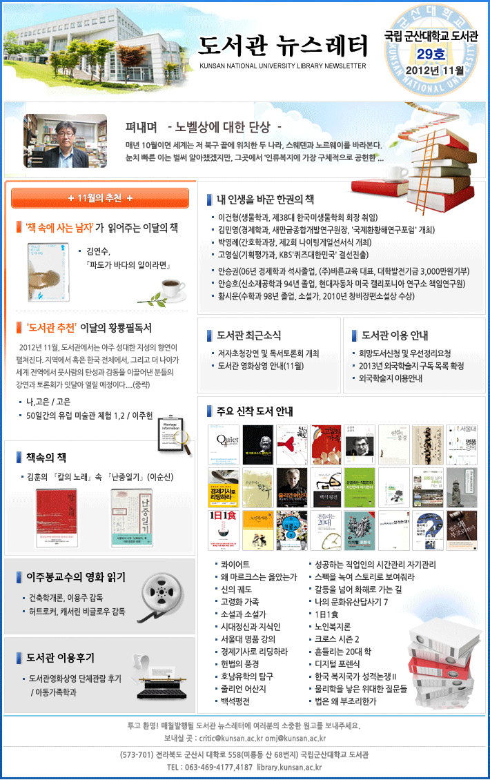 Æì³»¸ç('³ëº§»ó¿¡ ´ëÇÑ ´Ü»ó') 11¿ùÀÇ Ãßõ('Ã¥ ¼Ó¿¡ »ç´Â ³²ÀÚ'°¡ ÀоîÁÖ´Â ÀÌ´ÞÀÇ Ã¥, 'µµ¼°ü Ãßõ' ÀÌ´ÞÀÇ È²·æÇʵ¶¼), µµ¼°ü ÀÌ¿ë¾È³»(Èñ¸Áµµ¼½Åû ¹× ¿ì¼±Á¤¸®¿äû, ¿Ü±¹ÇмúÁöÀÌ¿ë¾È³», ¿Ü±¹ÇмúÁö ±¸µ¶¸ñ·Ï¾È³»), µµ¼°ü ÀÌ¿ëÈıâ, µµ¼°ü ÃÖ±Ù¼Ò½Ä(ÀúÀÚÃÊû°¿¬ ¹× µ¶¼Åä·Ðȸ °³ÃÖ, µµ¼°ü ¿µÈ»ó¿µ(11¿ù)), Ã¥¼ÓÀÇ Ã¥(±èÈÆÀÇ'Ä®ÀÇ ³ë·¡' ¼ÓÀÇ '³ÁßÀϱâ'À̼ø½Å), ÁÖ¿ä ½ÅÂø µµ¼ ¾È³», ³» ÀλýÀ» ¹Ù²Û ÇѱÇÀÇ Ã¥, °Ô½Ã¹° ³»¿ë º¸±â