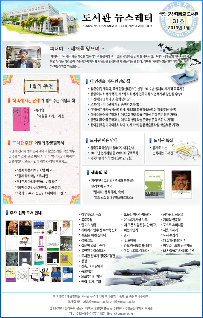 Æì³»¸ç('»õÇØ¸¦ ¸ÂÀ¸¸ç') 1¿ùÀÇ Ãßõ('Ã¥ ¼Ó¿¡ »ç´Â ³²ÀÚ'°¡ ÀоîÁÖ´Â ÀÌ´ÞÀÇ Ã¥, 'µµ¼°ü Ãßõ' ÀÌ´ÞÀÇ È²·æÇʵ¶¼), µµ¼°ü ÀÌ¿ë¾È³»(Çѱ¹±³À°ÇмúÁ¤º¸¿øÀÌ¿ë¾È³», 2013³â ÀüÀÚÀú³Î ¹× Web DB ±¸µ¶ÇöȲ, ¿Ü±¹ÇмúÁö ÀÌ¿ë¾È³») µµ¼°ü ƯÁý(Åë°è·Î º¸´Â º¯ÈÇÏ´Â µµ¼°ü), Ã¥¼ÓÀÇ Ã¥(°¡¶óŸ´Ï °íÁøÀÇ '¿ª»ç¿Í ¹Ýº¹'°ú '½½¶óº¸¿¹ ÁöÁ§ÀÇ '¸ØÃç¶ó, »ý°¢Ç϶ó' ¼ÓÀÇ 'ÇÁ¶û½ºÇõ¸í 3ºÎÀÛ'(¸¶¸£Å©½º), ÁÖ¿ä ½ÅÂø µµ¼ ¾È³», ³» ÀλýÀ» ¹Ù²Û ÇѱÇÀÇ Ã¥, °Ô½Ã¹° ³»¿ë º¸±â
