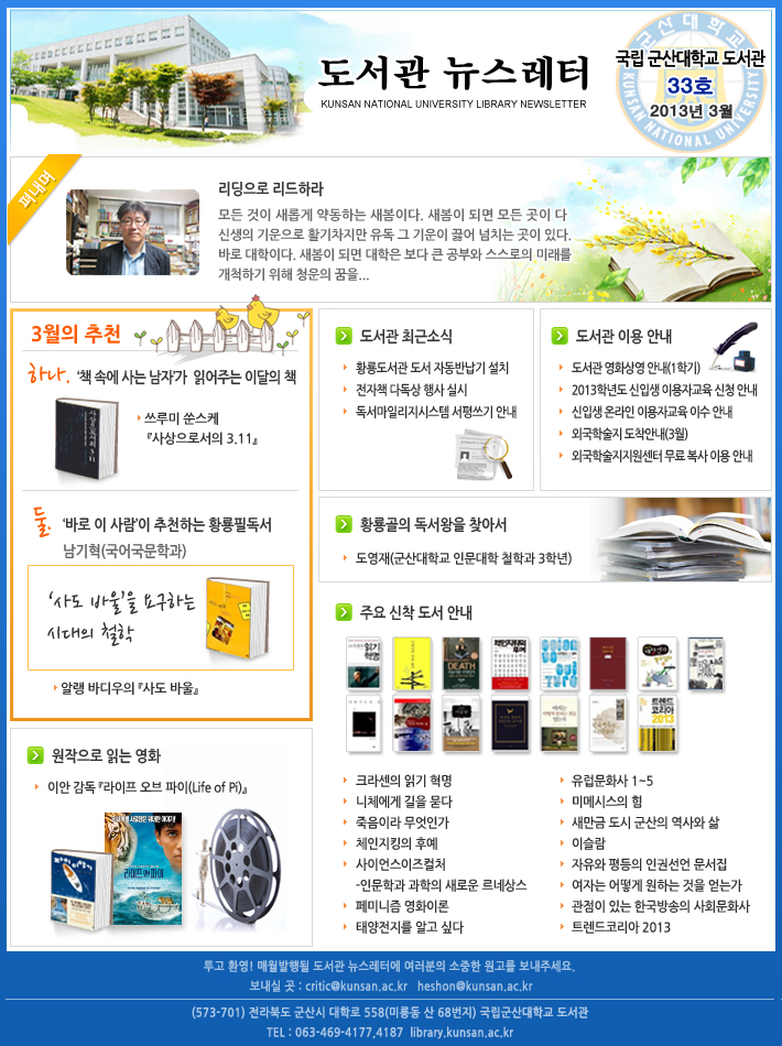 Æì³»¸ç('¸®µùÀ¸·Î ¸®µåÇ϶ó') 3¿ùÀÇ Ãßõ('Ã¥ ¼Ó¿¡ »ç´Â ³²ÀÚ'°¡ ÀоîÁÖ´Â ÀÌ´ÞÀÇ Ã¥, '¹Ù·Î ÀÌ »ç¶÷'ÀÌ ÃßõÇϴ Ȳ·æÇʵ¶¼), µµ¼°ü ÀÌ¿ë¾È³»(µµ¼°ü¿µÈ»ó¿µ, 2013³â ½ÅÀÔ»ý ÀÌ¿ëÀÚ±³À° ½Åû, ¿Ü±¹ÇмúÁö µµÂø¾È³», ½ÅÀÔ»ý ¿Â¶óÀÎ ÀÌ¿ëÀÚ±³À° À̼ö ¾È³») Ȳ·æµµ¼°ü µµ¼ ÀÚµ¿¹Ý³³±â ¼³Ä¡, ¿øÀÛÀ¸·Î Àд ¿µÈ(ÀÌ¾È °¨µ¶ ¶óÀÌÇÁ ¿Àºê ÆÄÀÌ(Life of Pi), Ȳ·æ°ñÀÇ µ¶¼¿ÕÀ» ã¾Æ¼, ÁÖ¿ä ½ÅÂøµµ¼¾È³» °Ô½Ã¹° ³»¿ë º¸±â