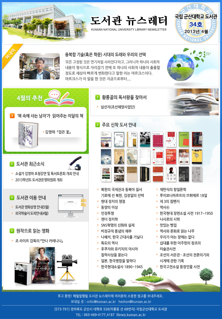 Æì³»¸ç('À¶º¹ÇÕ ±â¼ú(ȤÀº Çй®) ½Ã´ëÀÇ µµ·¡¿Í ¿ì¸®ÀÇ ¼±ÅÃ') 4¿ùÀÇ Ãßõ('Ã¥ ¼Ó¿¡ »ç´Â ³²ÀÚ'°¡ ÀоîÁÖ´Â ÀÌ´ÞÀÇ Ã¥, ±è¿µÇÏ '°ËÀº²É'), µµ¼°üÃÖ±Ù¼Ò½Ä(¼Ò¼³°¡ ±è¿µÇÏ ÃÊû°¿¬ ¹× µ¶¼Åä·Ðȸ °³ÃÖ µî),µµ¼°ü ÀÌ¿ë¾È³»(µµ¼°ü¿µÈ»ó¿µ, ¿Ü±¹ÇмúÁö µµÂø¾È³», ¿øÀÛÀ¸·Î Àд ¿µÈ(Á¶ ¶óÀÌÆ® °¨µ¶ÀÇ ¡¸¾È³ª Ä«·¹´Ï³ª¡¹), Ȳ·æ°ñÀÇ µ¶¼¿ÕÀ» ã¾Æ¼, ÁÖ¿ä ½ÅÂøµµ¼¾È³» °Ô½Ã¹° ³»¿ë º¸±â