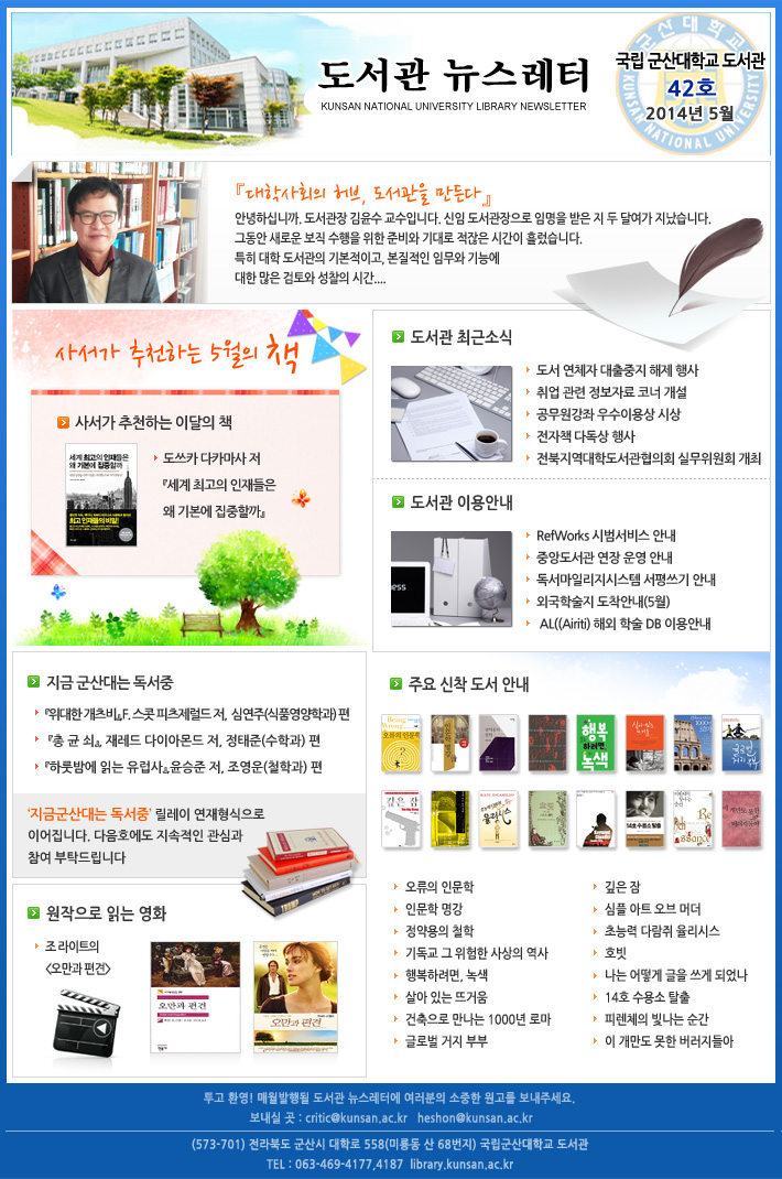 Æì³»¸ç('´ëÇлçȸÀÇ Çãºê, µµ¼°üÀ» ¸¸µç´Ù')5¿ùÀÇ Ãßõ '»ç¼°¡ ÃßõÇÏ´Â ÀÌ´ÞÀÇ Ã¥, µµ¾²Ä« ´ÙÄ«¸¶»ç '¼¼°è ÃÖ°íÀÇ ÀÎÀçµéÀº ¿Ö ±âº»¿¡ ÁýÁßÇÒ±î'), µµ¼°üÃÖ±Ù¼Ò½Ä ¹× ÀÌ¿ë¾È³», ¿øÀÛÀ¸·Î Àд ¿µÈ( Á¶¶óÀÌÆ®ÀÇ ¡¸¿À¸¸°ú Æí°ß¡¹), ÁÖ¿ä ½ÅÂøµµ¼¾È³», 'Áö±Ý ±º»ê´ë´Â µ¶¼Áß' °Ô½Ã¹° ³»¿ë º¸±â