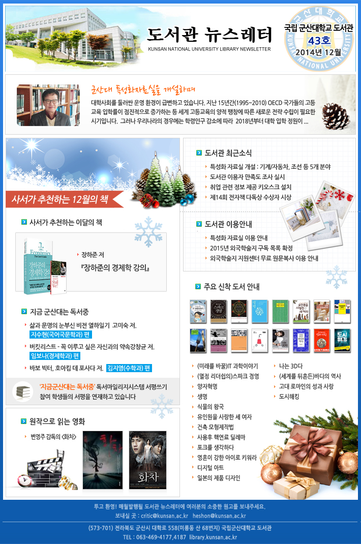 ±º»ê´ë Ư¼ºÈ ÀÚ·á½ÇÀ» °³¼³Çϸç, »ç¼°¡ ÃßõÇÏ´Â 12¿ùÀÇ Ã¥(ÀåÇÏÁØÀÇ °æÁ¦ÇÐ °ÀÇ), µµ¼°ü ÃÖ±Ù¼Ò½Ä & ÀÌ¿ë¾È³», ¿øÀÛÀ¸·Î Àд ¿µÈ(¹ø¿µÁÖ °¨µ¶ÀÇ 'ÈÂ÷'), ÁÖ¿ä ½ÅÂø µµ¼ ¾È³», Áö±Ý ±º»ê´ë´Â µ¶¼Áß °Ô½Ã¹° ³»¿ë º¸±â