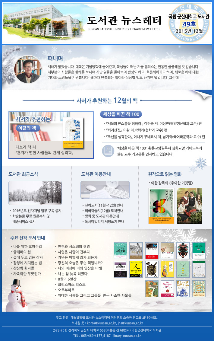 Æì³»¸ç('´ëÇп¡¼ ÈûÂ÷°Ô ¾àµ¿ÇÏÀÚ'), 12¿ùÀÇ Ãßõ '»ç¼°¡ ÃßõÇÏ´Â ÀÌ´ÞÀÇ Ã¥, (µ¥º¸¶ó Àè Àú 'È¥ÀÚ°¡ ÆíÇÑ »ç¶÷µéÀÇ °ü°è ½É¸®ÇÐ'), µµ¼°ü ÃÖ±Ù ¼Ò½Ä ¹× ÀÌ¿ë¾È³», ¿øÀÛÀ¸·Î Àд ¿µÈ(ÀÌÇÑ °¨µ¶ÀÇ ¡¸¿ì¾ÆÇÑ °ÅÁþ¸»¡¹), ÁÖ¿ä ½ÅÂøµµ¼ ¾È³», '¼¼»óÀ» ¹Ù²Û Ã¥ 100' °Ô½Ã¹° ³»¿ë º¸±â