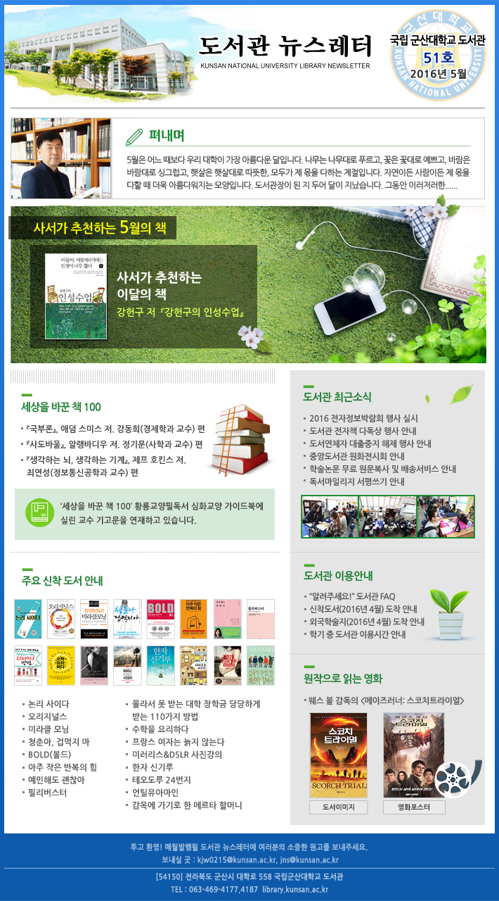 Æì³»¸ç(Á¦ ¸òÀ» ´ÙÇÏ´Â ¾Æ¸§´Ù¿î µµ¼°üÀ» »ó»óÇÕ´Ï´Ù'), 5¿ùÀÇ Ãßõ '»ç¼°¡ ÃßõÇÏ´Â ÀÌ´ÞÀÇ Ã¥, (°Ç屸 Àú '°Ç屸ÀÇ Àμº¼ö¾÷'), µµ¼°ü ÃÖ±Ù ¼Ò½Ä ¹× ÀÌ¿ë¾È³», ¿øÀÛÀ¸·Î Àд ¿µÈ(¿þ½º º¼ °¨µ¶ÀÇ ¡¸¸ÞÀÌÁî·¯³Ê:½ºÄÚġƮ¶óÀ̾ó¡¹), ÁÖ¿ä ½ÅÂøµµ¼ ¾È³», '¼¼»óÀ» ¹Ù²Û Ã¥ 100' °Ô½Ã¹° ³»¿ë º¸±â