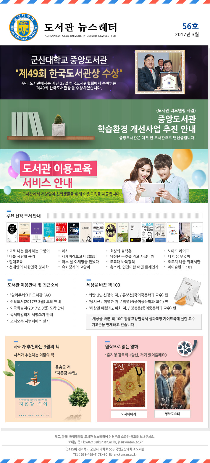 ÇмúÁ¤º¸¾È³», 3¿ùÀÇ Ãßõ '»ç¼°¡ ÃßõÇÏ´Â ÀÌ´ÞÀÇ Ã¥, (À±È«±Õ Àú 'ÀÚÁ¸°¨ ¼ö¾÷'), µµ¼°ü ÃÖ±Ù ¼Ò½Ä ¹× ÀÌ¿ë¾È³», ¿øÀÛÀ¸·Î Àд ¿µÈ(È«Áö¿µ °¨µ¶ÀÇ ¡¸´ç½Å, °Å±â ÀÖ¾îÁÙ·¡¿ä¡¹), ÁÖ¿ä ½ÅÂøµµ¼ ¾È³», '¼¼»óÀ» ¹Ù²Û Ã¥ 100' °Ô½Ã¹° ³»¿ë º¸±â