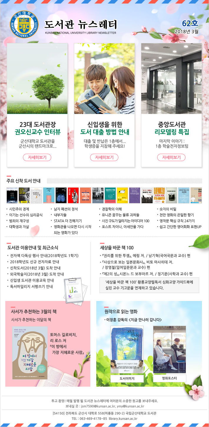 ÇмúÁ¤º¸¾È³», 3¿ùÀÇ Ãßõ '»ç¼°¡ ÃßõÇÏ´Â ÀÌ´ÞÀÇ Ã¥, (Åä¸Ó½º ±æ·ÎºñÄ¡ Àú 'ÀÌ ¹æ¿¡¼ °¡Àå ÁöÇý·Î¿î »ç¶÷'), µµ¼°ü ÃÖ±Ù ¼Ò½Ä ¹× ÀÌ¿ë¾È³», ¿øÀÛÀ¸·Î Àд ¿µÈ(ÀÌÀåÈÆ °¨µ¶ÀÇ¡¸Áö±Ý ¸¸³ª·¯ °©´Ï´Ù¡¹), ÁÖ¿ä ½ÅÂøµµ¼ ¾È³», '¼¼»óÀ» ¹Ù²ÛÃ¥100' °Ô½Ã¹° ³»¿ë º¸±â