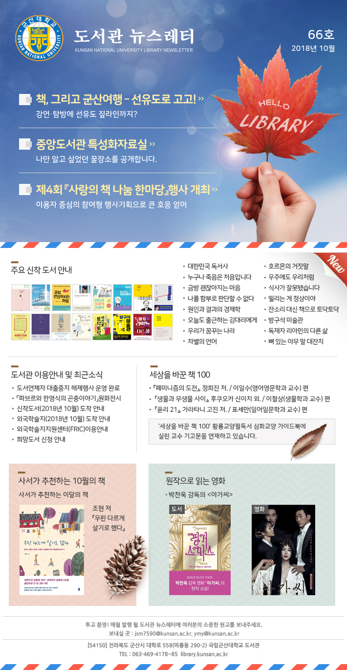 ÇмúÁ¤º¸¾È³», 10¿ùÀÇ Ãßõ '»ç¼°¡ ÃßõÇÏ´Â ÀÌ´ÞÀÇ Ã¥, (Á¶Çö Àú ¿ì¸° ´Ù¸£°Ô »ì±â·Î Çß´Ù'), µµ¼°ü ÃÖ±Ù ¼Ò½Ä ¹× ÀÌ¿ë¾È³», ¿øÀÛÀ¸·Î Àд ¿µÈ(¹ÚÂù¿í °¨µ¶ÀÇ¡¸¾Æ°¡¾¾¡¹), ÁÖ¿ä ½ÅÂøµµ¼ ¾È³», '¼¼»óÀ» ¹Ù²ÛÃ¥100' °Ô½Ã¹° ³»¿ë º¸±â