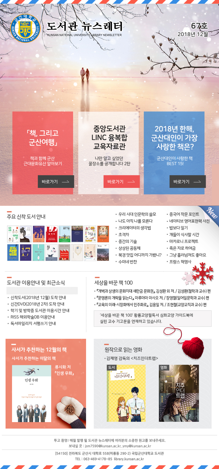 ÇмúÁ¤º¸¾È³», 12¿ùÀÇ Ãßõ '»ç¼°¡ ÃßõÇÏ´Â ÀÌ´ÞÀÇ Ã¥, (·ù½ÃÈ Àú 'Àλý¿ìÈ'), µµ¼°ü ÃÖ±Ù ¼Ò½Ä ¹× ÀÌ¿ë¾È³», ¿øÀÛÀ¸·Î Àд ¿µÈ(±èÁ¦¿µ °¨µ¶ÀÇ¡¸Ä¡ÁîÀδõÆ®·¦¡¹), ÁÖ¿ä ½ÅÂøµµ¼ ¾È³», '¼¼»óÀ» ¹Ù²ÛÃ¥100' °Ô½Ã¹° ³»¿ë º¸±â