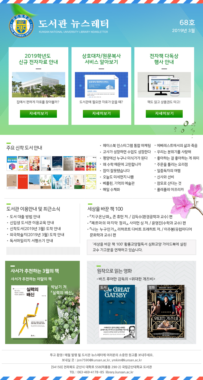 ÇмúÁ¤º¸¾È³», 3¿ùÀÇ Ãßõ '»ç¼°¡ ÃßõÇÏ´Â ÀÌ´ÞÀÇ Ã¥, (¹Ú³²±â Àú '½Ç·ÂÀÇ ¹è½Å'), µµ¼°ü ÃÖ±Ù ¼Ò½Ä ¹× ÀÌ¿ë¾È³», ¿øÀÛÀ¸·Î Àд ¿µÈ(¹ÙÁî ·ç¾î¸¸ °¨µ¶ÀÇ¡¸À§´ëÇÑ °³Ã÷ºñ¡¹), ÁÖ¿ä ½ÅÂøµµ¼ ¾È³», '¼¼»óÀ» ¹Ù²ÛÃ¥100' °Ô½Ã¹° ³»¿ë º¸±â