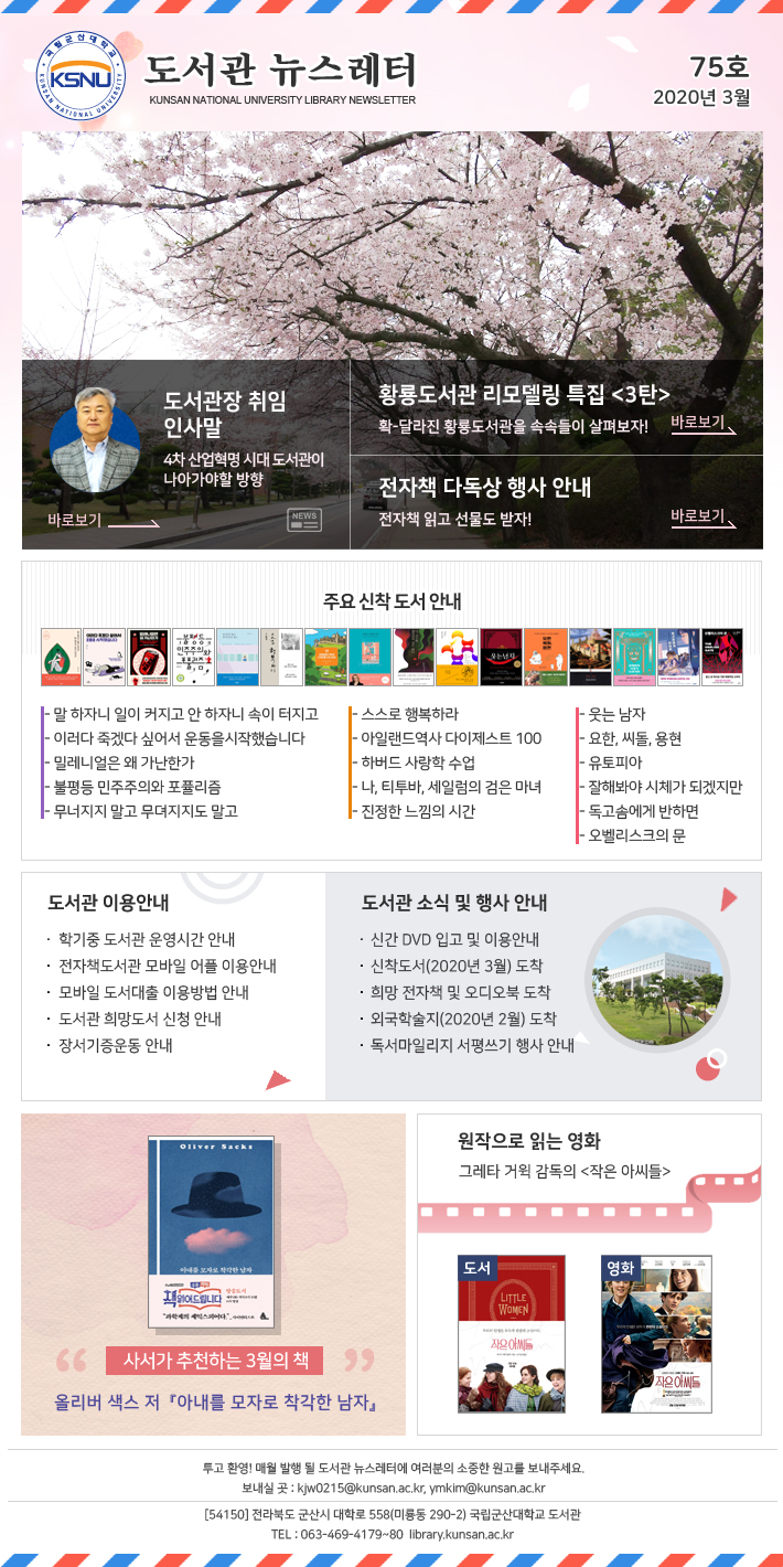 ÇмúÁ¤º¸¾È³», 3¿ùÀÇ Ãßõ '»ç¼°¡ ÃßõÇÏ´Â ÀÌ´ÞÀÇ Ã¥, (¿Ã¸®¹ö »ö½º Àú '¾Æ³»¸¦ ¸ðÀÚ·Î Âø°¢ÇÑ ³²ÀÚ'), µµ¼°ü ÃÖ±Ù ¼Ò½Ä ¹× Çà»ç, ÀÌ¿ë¾È³», ¿øÀÛÀ¸·Î Àд ¿µÈ(±×·¹Å¸ °ÅÀ¨ °¨µ¶ÀÇ¡¸ÀÛÀº ¾Æ¾¾µé¡¹), ÁÖ¿ä ½ÅÂøµµ¼ ¾È³» °Ô½Ã¹° ³»¿ë º¸±â