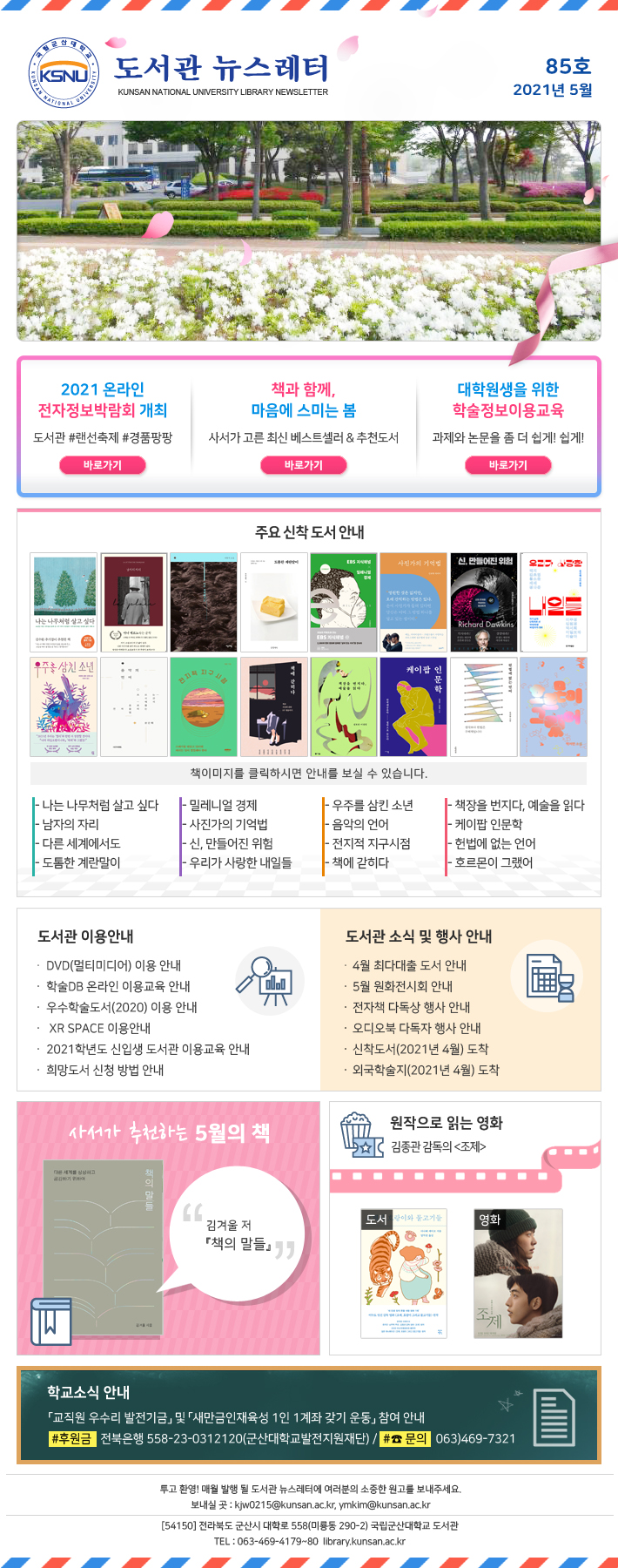 ÇмúÁ¤º¸¾È³», 5¿ùÀÇ Ãßõ '»ç¼°¡ ÃßõÇÏ´Â ÀÌ´ÞÀÇ Ã¥, (±è°Ü¿ï Àú 'Ã¥ÀÇ ¸»µé'), µµ¼°ü ÃÖ±Ù ¼Ò½Ä ¹× Çà»ç, ÀÌ¿ë¾È³», ¿øÀÛÀ¸·Î Àд ¿µÈ(±èÁ¾°ü °¨µ¶ÀÇ¡¸Á¶Á¦¡¹), ÁÖ¿ä ½ÅÂøµµ¼ ¾È³» °Ô½Ã¹° ³»¿ë º¸±â
