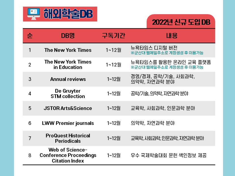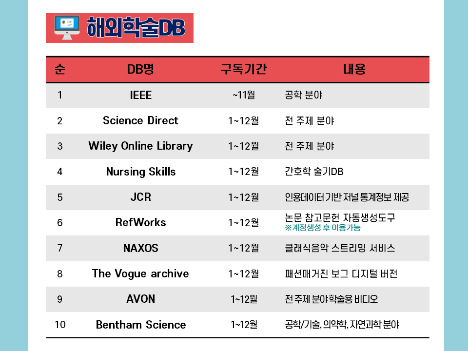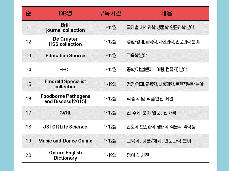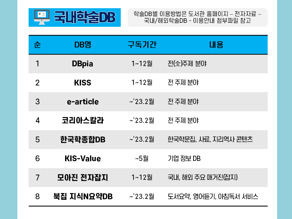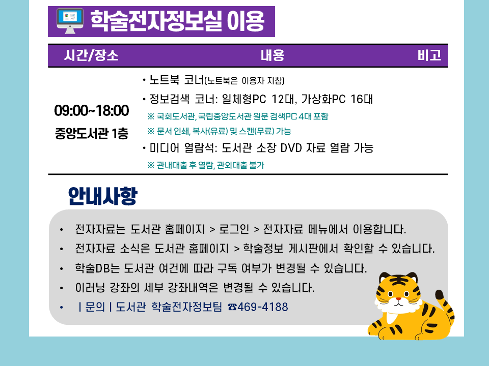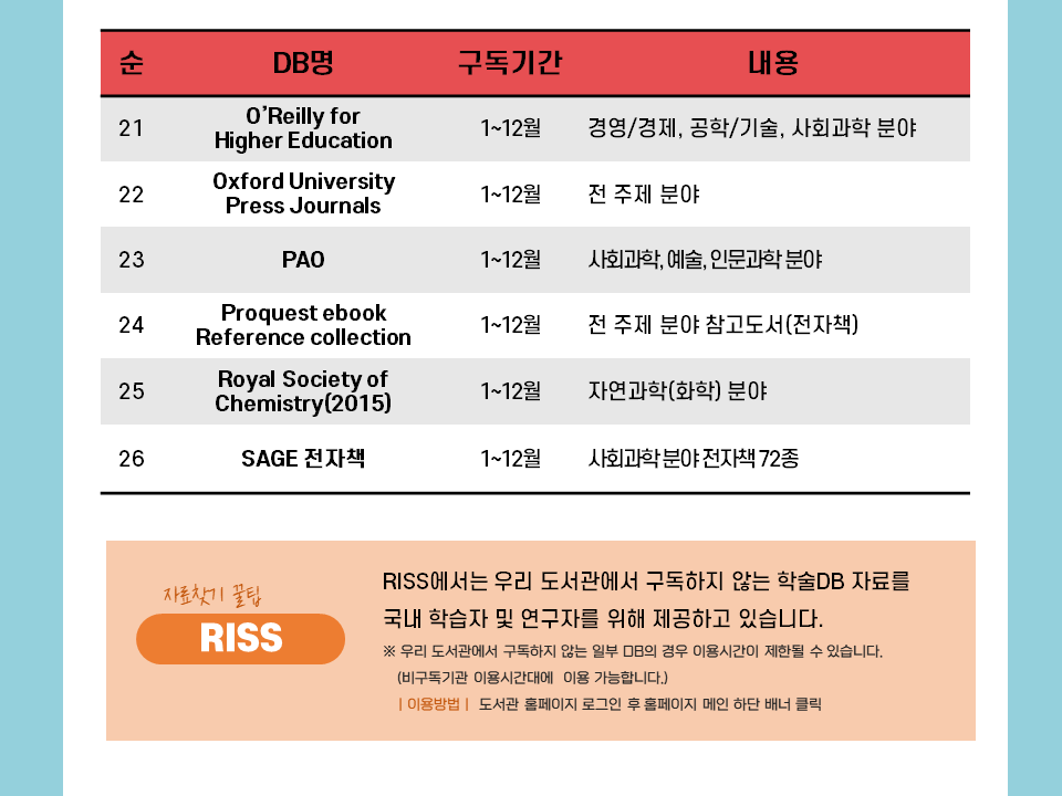 µµ¼°ü¿¡¼´Â ´ëÇÐ ±¸¼º¿øÀÇ ÇнÀ ¹× ¿¬±¸È°µ¿À» Áö¿øÇϱâ À§ÇÏ¿© ±¹³»/¿Ü ÇмúDB¸¦ ±¸µ¶ÇÏ¿© Á¦°øÇÒ »Ó¸¸ ¾Æ´Ï¶ó ÀüÀÚÃ¥/¿Àµð¿ÀºÏ, ¸ÖƼ¹Ìµð¾î(DVD)ÀÚ·á, ÀÌ·¯´× °ÁÂ(°ø¹«¿ø,ÀÚ°ÝÁõ) µî ´Ù¾çÇÑ ¿Â¶óÀÎ Á¤º¸ÀÚ¿øÀ» Á¦°øÇϰí ÀÖ½À´Ï´Ù. ¤Ó¹®ÀÇ¤Ó ÇмúÀüÀÚÁ¤º¸ÆÀ 469-4188