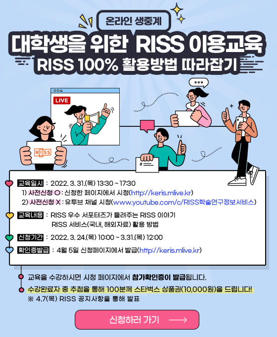¡Û ±³À°¸í: 2022³â RISS & ´ëÇжóÀ̼±½º DB À̿뱳À° ¡Û ±³À°ÀϽÃ: 2022. 3. 31.(¸ñ) 13:30~17:00 ¡Û ±³À°´ë»ó: ´ëÇÐ Çмú¿¬±¸ÀÚ(´ëÇлý, ´ëÇпø»ý, ±³Á÷¿ø) ¡Û ±³À°¹æ¹ý: ¿Â¶óÀÎ ±³À° ½Ãû(¹«·á) ¡Û ±³À°³»¿ë - RISS ¿ì¼ö ¼Æ÷ÅÍÁî°¡ µé·ÁÁÖ´Â ´ëÇлý RISS Ȱ¿ë¼ö±â - RISS »õ·Î¿î ¼ºñ½º ¹× ³»¿ë ¼Ò°³ - RISS ÀÌ¿ë ¿ì¼ö»ç·Ê ¹ßÇ¥ µî ¡Û ½Åû±â°£: 3. 24.(¸ñ)~ 3. 31.(¸ñ) 12:00 ¡Û ½ÅûURL: http://keris.mlive.kr