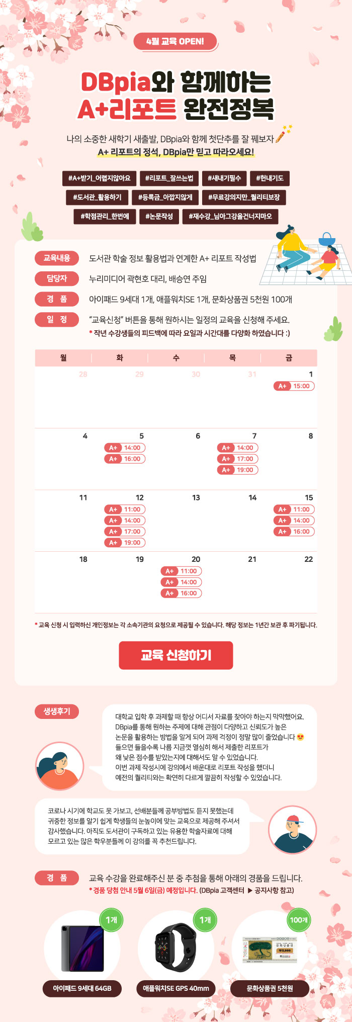 | Á¦ ¸ñ | [±³À°] DBpia 4¿ù À̿뱳À° ¾È³»(°æÇ° Ãß÷) | ||||