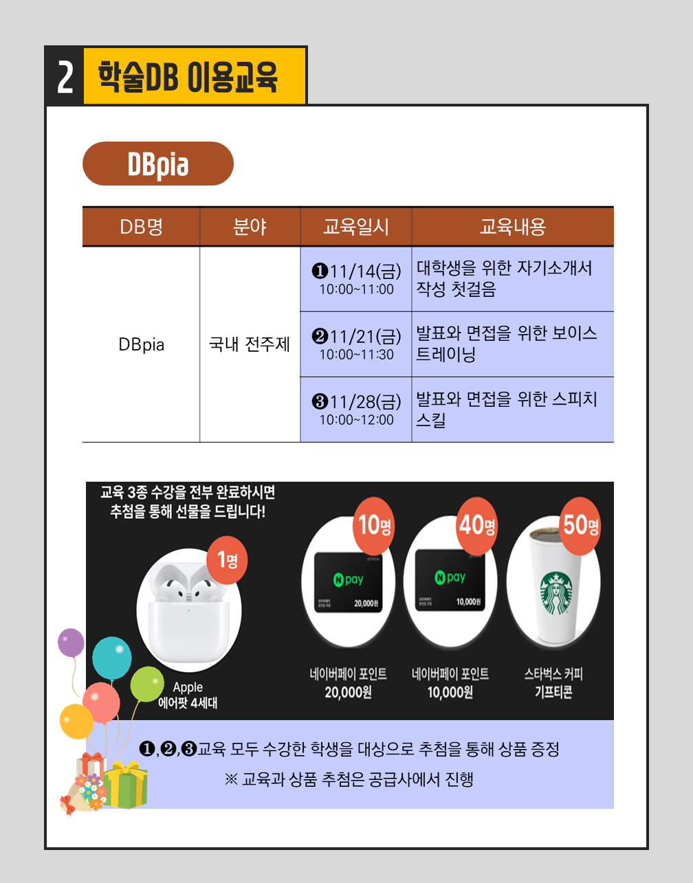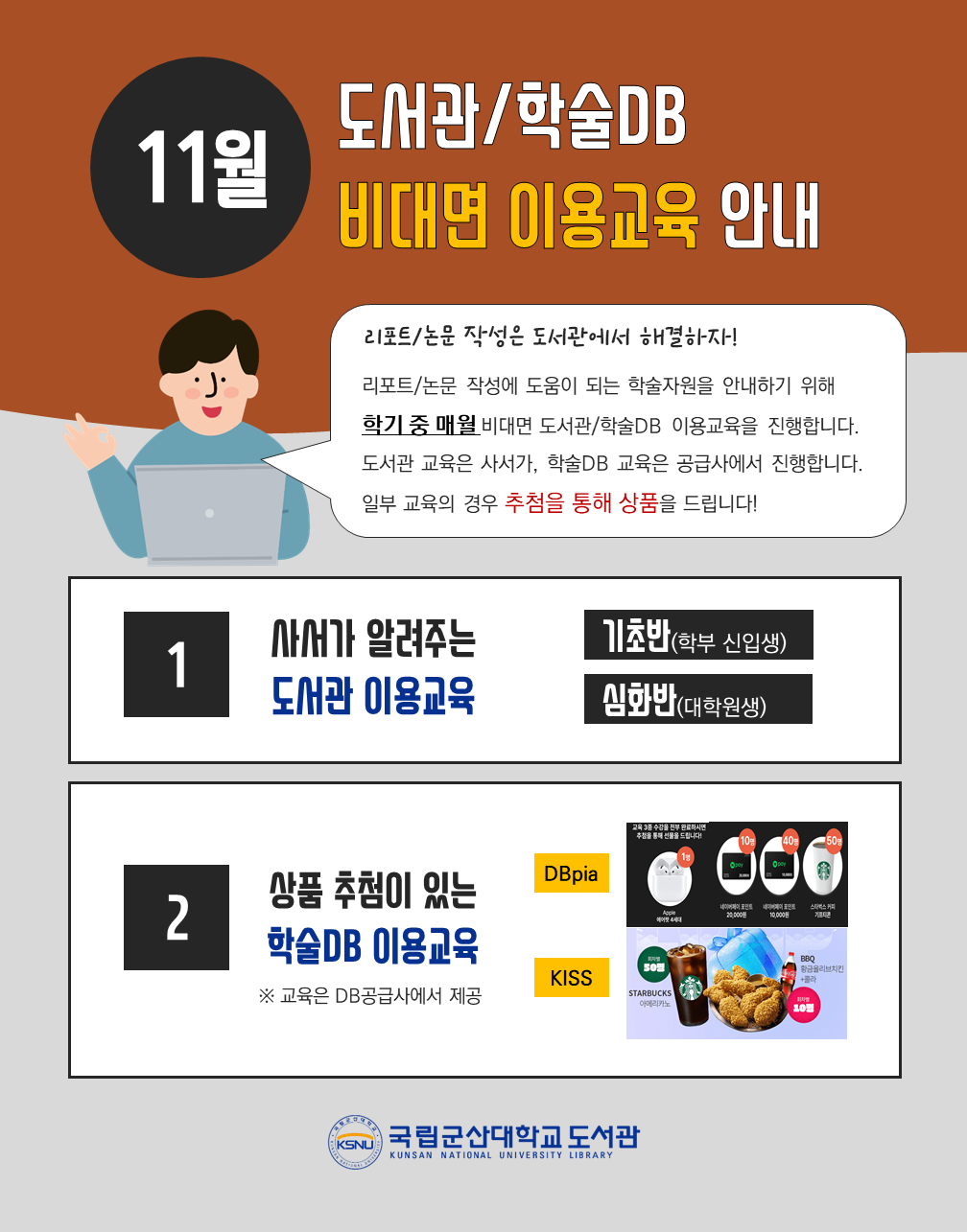 11¿ù ºñ´ë¸é µµ¼°ü/ÇмúDB À̿뱳À° ¾È³» ¸®Æ÷Æ®/³í¹® ÀÛ¼º¿¡ ÇÊ¿äÇÑ ´Ù¾çÇÑ Âü°í¹®ÇåÀ» µµ¼°ü¿¡¼ ã¾Æº¸¼¼¿ä. µµ¼°ü/ÇмúDB ÀÌ¿ë¹æ¹ýÀ» ÇбâÁß ¸Å¿ù ºñ´ë¸éÀ¸·Î ¾È³»ÇÕ´Ï´Ù. µµ¼°ü À̿뱳À°Àº »ç¼°¡, ÇмúDB À̿뱳À°Àº °ø±Þ»ç¿¡¼ Á¦°øÇÕ´Ï´Ù. ÀϺΠ±³À°ÀÇ °æ¿ì Ãß÷À» ÅëÇØ »óǰÀ» Á¦°øÇÏ´Ï ¸¹ÀÌ Âü¿©ÇØ ÁÖ¼¼¿ä. (¹®ÀÇ) µµ¼°ü 063-469-4188