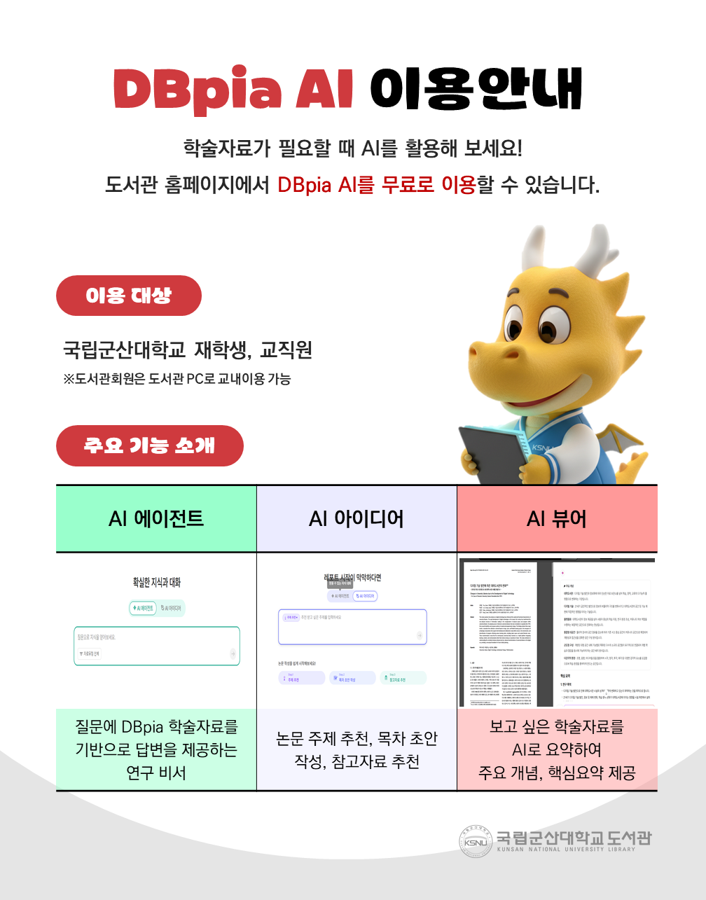 ´ëÇб¸¼º¿øÀÇ ÇнÀ°ú ¿¬±¸È°µ¿À» Áö¿øÇϱâ À§ÇÏ¿© DBpia AI ¼ºñ½º¸¦ Á¦°øÇÕ´Ï´Ù. * (ÁÖ¿ä±â´É) AI ¿¡ÀÌÀüÆ®, AI ¾ÆÀ̵ð¾î, AI ºä¾î